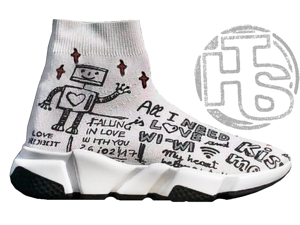 Кросівки BALENCIAGA Speed Trainer являє собою конструкцію носка з еластичною халявою. Верх виготовлений з легкого текстилю та за таким взуттям легко доглядати. Платформа з піни успішно справляється з гасінням ударної сили, а гумова підметка покращує зчеплення з поверхнею. Особливістю цієї моделі є принти на всій поверхні верху.